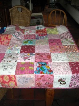 So last weekend this little girl visited us with her quilt to aks if I could mend it on some places where decorations came loose, so today I repaired all these little things and it looks great again. I am still surprised of the quality after it has been used so extensively. It has been washed and sterilized (in hospital) so many times and it still looks great.Then I was very happy with the result, all our friends did a great job making their blocks and it was a great quilt filled with love and well wishes and I am happy to see that she is still using it with pride.